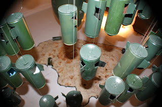 At 2:00 pm I stumbled into the dark building, and followed arrow marks painted onto the floor into a room that had a map of Syria on the floor, and paint cans covered in navy-green with little wings attached that appeared as a cluster of bombs over the map.