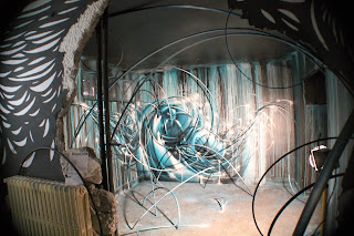 The final exhibition is of wall paintings and objects painted in white in a room lit only by flourescent lights. Ordinary objects (grocery carts, a mannequin, chairs, a television) glow eerily, discarded and lonely. The artists, Lek and Sowat, highlight the ultimate destruction that the building will be subject to, the frenetic splashes of glowing paint further disorienting a likely already-tired and sensorially-overloaded viewer before they are thrust back into the light of day, where all one can do is sit quietly for a moment, and try to return to a less aesthetically saturated ordinary.