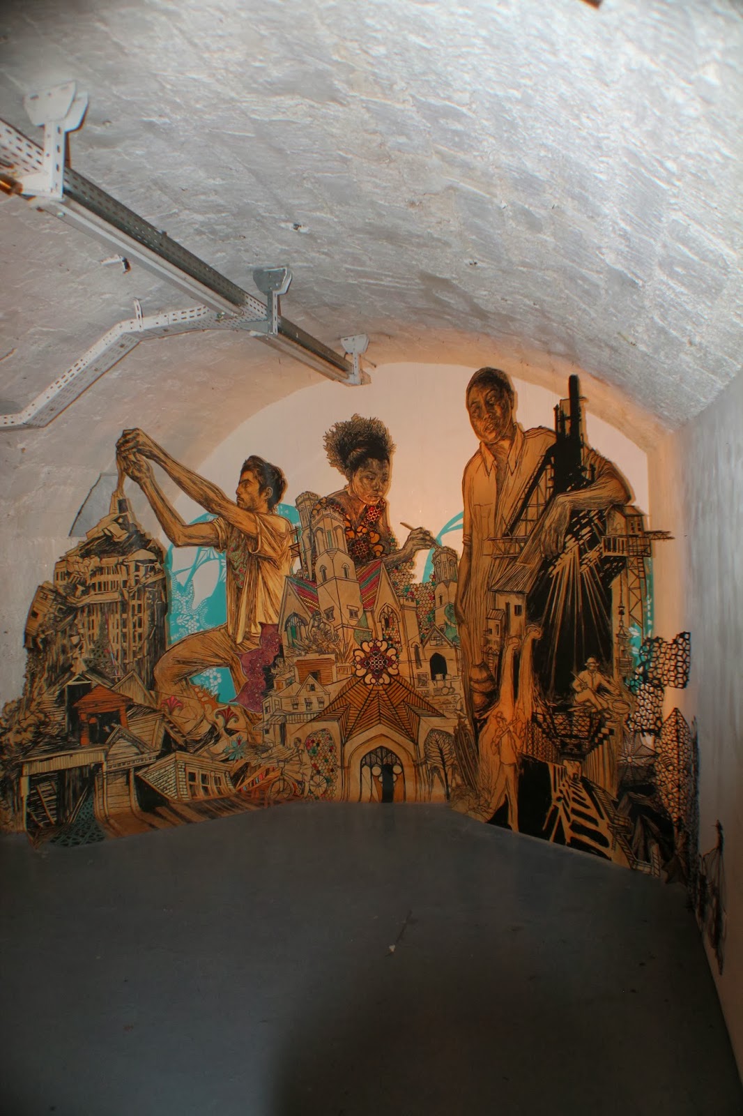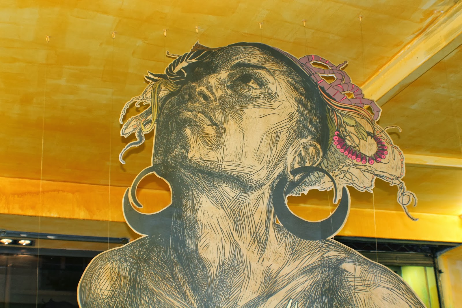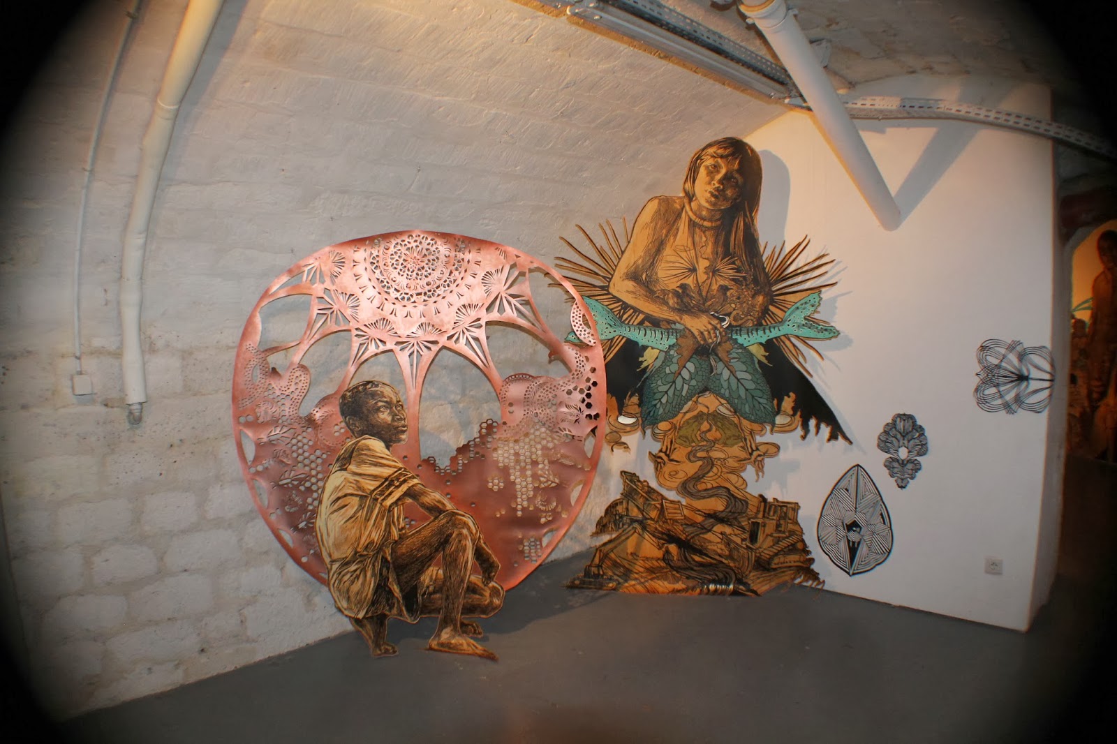 Swoon is a street artist based in Brooklyn, NY, who is world famous for her haunting ephemeral pieces, created using an iconic hand-drawn style, depicting human beings from all walks of life involved in a variety of activities. Her recent show in Paris, titled “Motherlands” and located at Gallery L.J. in Paris’ Oberkampf district, offers a compelling transnational exploration of what it is to make a place a home, and how that process necessarily involves community. As such, the exhibit actualizes what affective citizenship, grounded in a feminist ethic of participation, dialogue, and engagement, can look like in spaces that so often take the edge off of street art– an art genre that is intimately connected to its space of inscription in the street.
