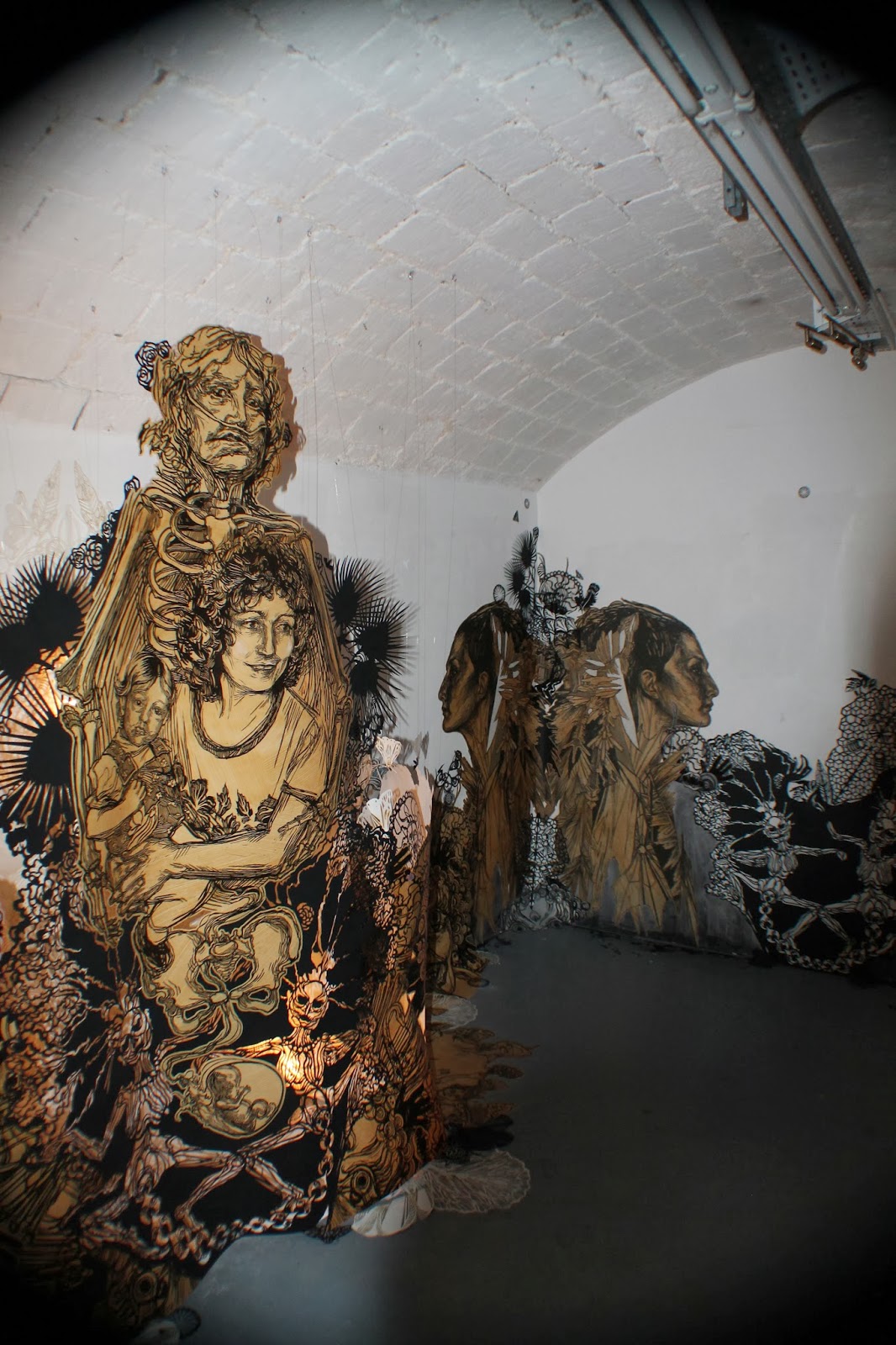 The series is made up of work that Swoon has created during the past three years, and draws from the people, spaces, and collective issues that framed her interactions. Moreover, the passing of her own mother in 2013 provides a poignant emotional background to the displays. Her aesthetic, which is based on constituting art that can decay, that grows and also dies in urban spaces, celebrates the beauty that such vulnerability can create. The embodied experience of walking around and with her various figures imparts to the viewer a sense of the simultaneous universality of human relations that involve creation and destruction, and life and death, but also the particularity of each of her characters, temporary actors on a stage of public life.
