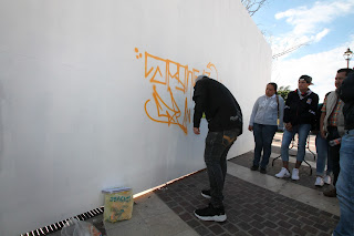 “There are hundreds of styles of graffiti,” Israel continued, “but no matter the style it is all about the need to communicate and express yourself.” He mentioned that some street art/arte urbano has become worth a lot of money, there is someone called Bansky, no one knows who they are, but it is probably a team and if he or they painted on your house it would be worth a lot of money, someone might come and try to take it off and sell it.” “For millions,” a youth added. This youth was from Leon and was clearly already an accomplished tagger because what he painted was fluid and defined. When Gerald finished his mini piece he asked, “Preguntas? Dudas? Does anyone want to paint?” “You should paint!” someone said to one of the young women. “Noooo!” she demurred, giggling into a group of girls, who also exploded into giggles. “Write ‘Paula!’” one of the boys persisted. She ultimately ended up painting, and Geraldo helped another girl with her piece, creating an outline that she could fill. The youth painted and played around for another 10 minutes and then the teacher thanked the instructors and led them away. Then the guys stayed at the wall, answering questions and giving mini summaries of the history to the curious.